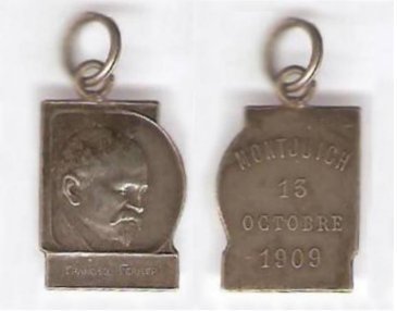 Una segona medalla, aquesta localitzada a França, és una petita peça de 21 x 16 mm que reprodueix el bust de Ferrer amb el perfil a la dreta inserit dins un cercle i, sobreposat al darrera, un enquadrament (fig. 2). A l’exerg hi ha la llegenda: / FRANCISCO FERRER /. Al costat s’hi pot llegir la signatura Le Roux, autor que no hem pogut identificar. El revers duu la llegenda: / MONTJUICH / 13 / OCTOBRE / 1909 /. És d’alumini i té una anella per penjar. La posició del perfil ens fa pensar que Le Roux modelà el rostre basant-se en una fotografia, atès que hi ha diversos retrats del pedagog presos des d’aquest angle. Probablement la medalla va ser promoguda per una entitat vinculada al lliure pensament. Desconeixem si és una producció gal·la o d’un altre país francòfon, tot i que per la transcendència que la mort de Ferrer va tenir a França i pel fet que l’haguem trobat allà, creiem que va ser produïda en aquest país.