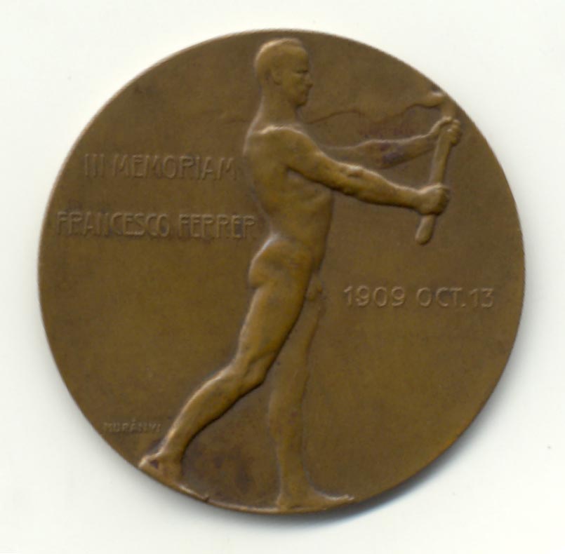 La cinquena va ser editada a Hongria i té una factura excel·lent, sens dubte la millor de les que comentem (fig. 4), obra de l’escultor i medallista Gyula Murányi (Budapest, 1881-1920).8 Es tracta d’una medalla uniface, de 50 mm de diàmetre, de bronze i amb una bonica pàtina, que presenta una figura masculina dempeus sostenint una torxa (el Coneixement il·luminat). Té la llegenda: / IN MEMORIAM / FRANCESCO FERRER /, a l’esquerra i: / 1909 OCT. 13 /, a la dreta. Està signada MURÁNYI a la part inferior. Malauradament no coneixem qui li encarregà ni el taller que la fabricà, però per la data en què va ser feta tot fa pensar que, o va ser realitzada per iniciativa pròpia (li coneixem altres casos) o bé per alguna entitat o institució que, com en les anteriors, preferí no aparèixer encunyada.