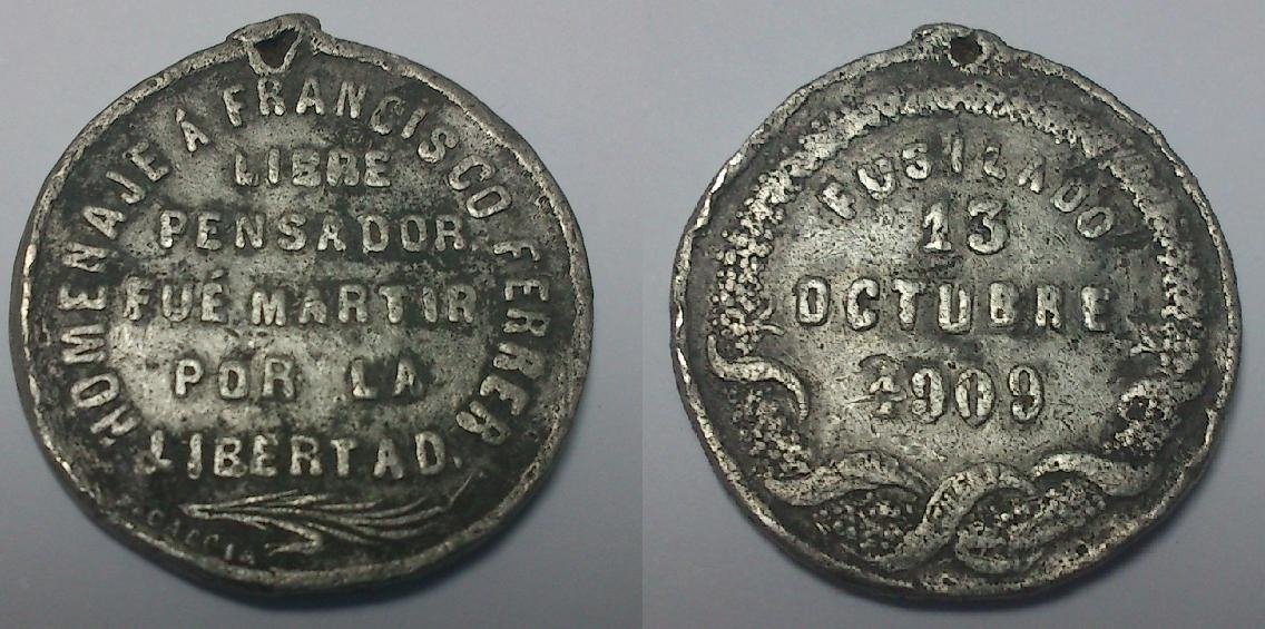 L’any 1909 la mort de Francesc Ferrer i Guardia va generar moltes mostres de rebuig arreu del món, que trobaren diferents maneres d’expressió: manifestacions, ofrenes florals, escrits, monuments… Alhora que s’editaren diversos records en la seva memòria, com postals, publicacions o medalles. Manca encara un estudi sobre aquelles formes materials d’expressió, de manera que aquestes línies volen ser una aportació pel que fa a les peces numismàtiques.1 Recollim a continuació cinc medalles referides, totes europees, una d’elles encara inèdita.